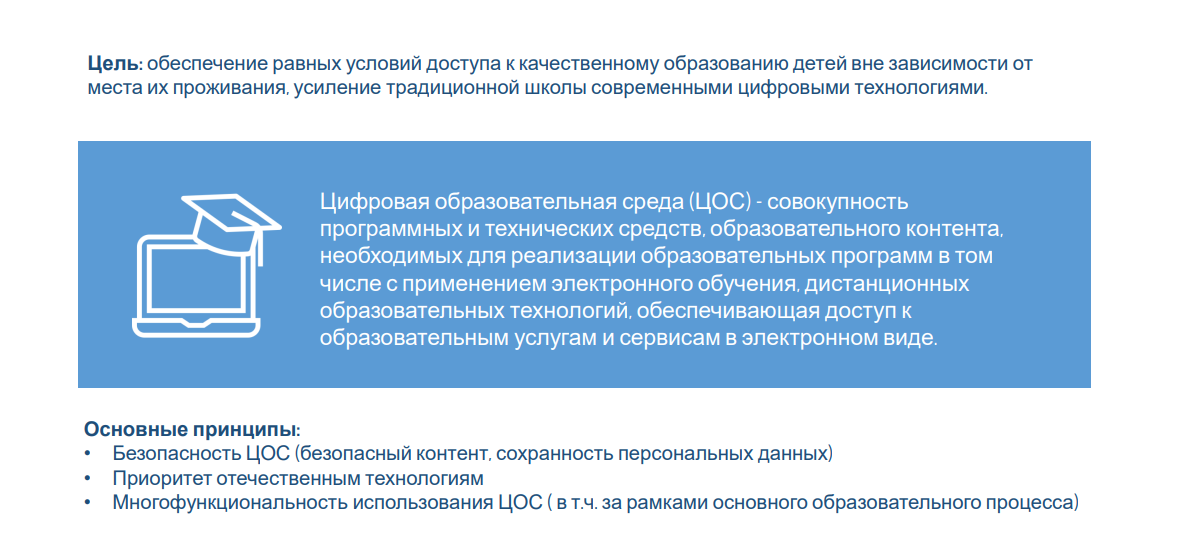 Федеральный проект "Цифровая образовательная среда" направлен на создание в образовательных организациях цифровой образовательной среды, а также обеспечение реализации цифровой трансформации системы образования. В рамках проекта ведется работа по оснащению образовательной организации современным оборудованием и развитием цифровых сервисов и контента для образовательной деятельности.